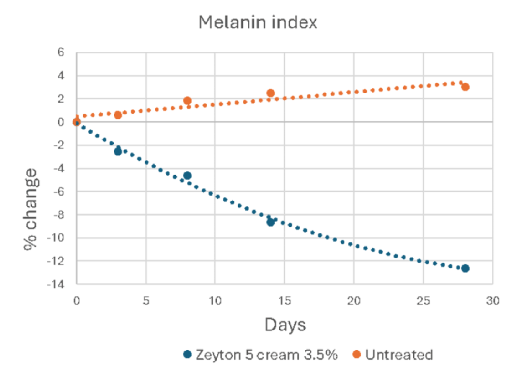 Creams and serums with 3.5% of the ingredient, Zeyton 5 (liquid) or with Zeyton 6 (powder) reduced the melanin index at all points, reaching about 15% in 28 days compared to untreated skin. All measurements are non-invasive, safe and well-tolerated, with no adverse events expected in standard use.